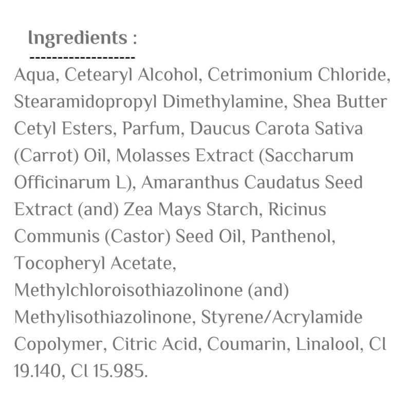 يحتوي على مكونات هامة تمنع تقصف الشعر التالف مما يساعد على نمو الشعر الصحي مثل دبس القصب وزيت الجزر ، بالاضافة للأحماض الامينية تجعل تمشيط الشعر أسهل بكثير .