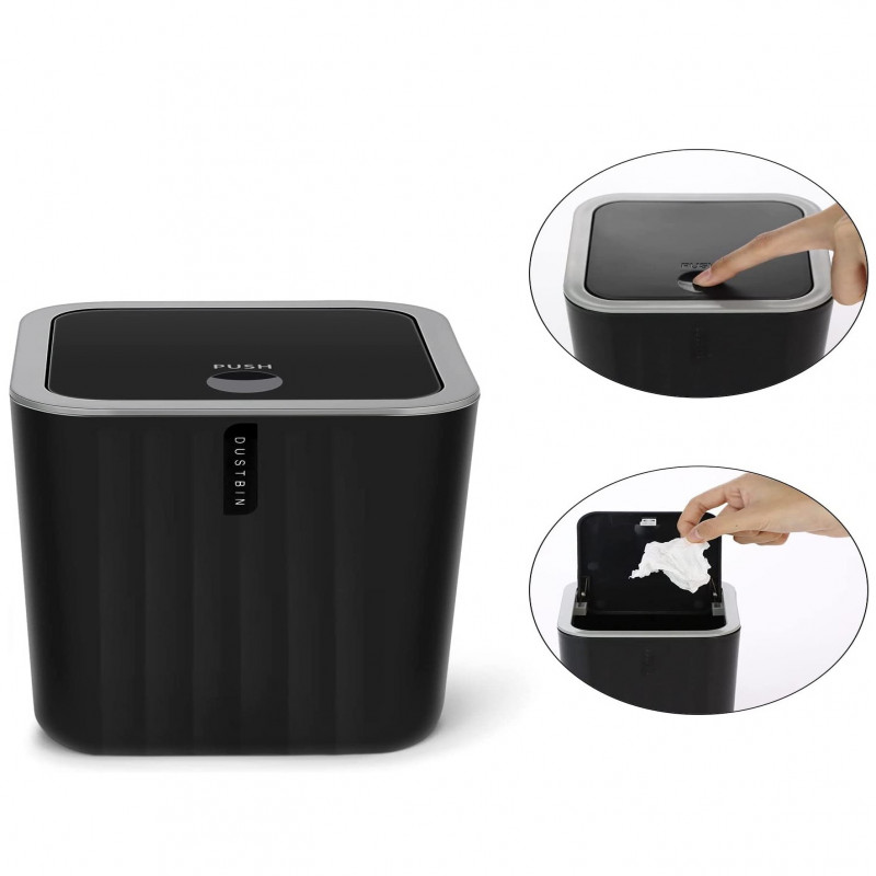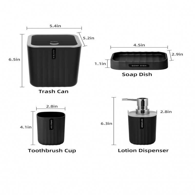 سلة المهملات: 14x14x16 سم وعاء الصابون: 13x8x2 سم وموزع اللوشن: 7x7x17 سم والكوب: 7x7x10 سم